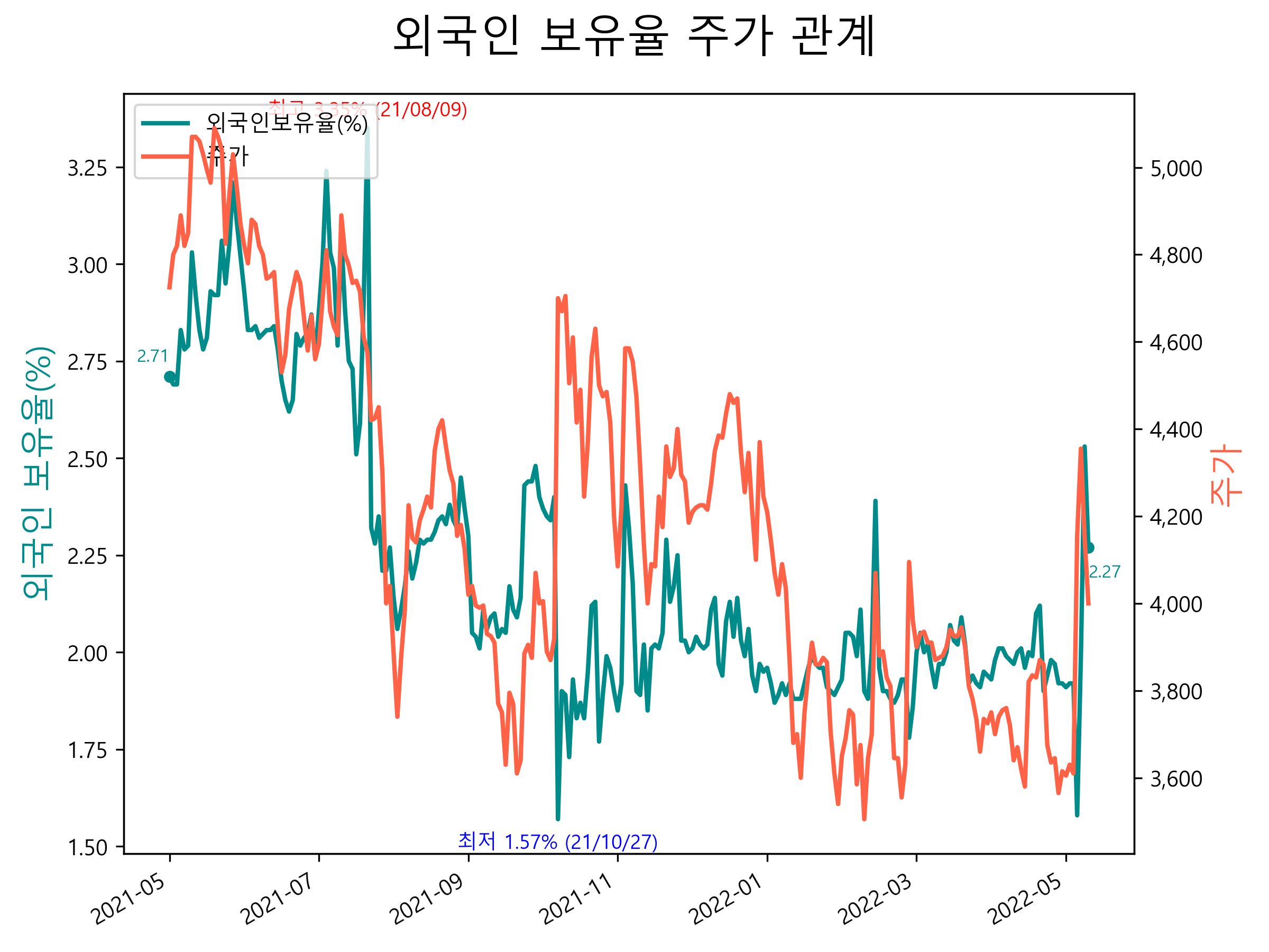 최근 1년간 외국인 보유율 및 주가와의 관계입니다.