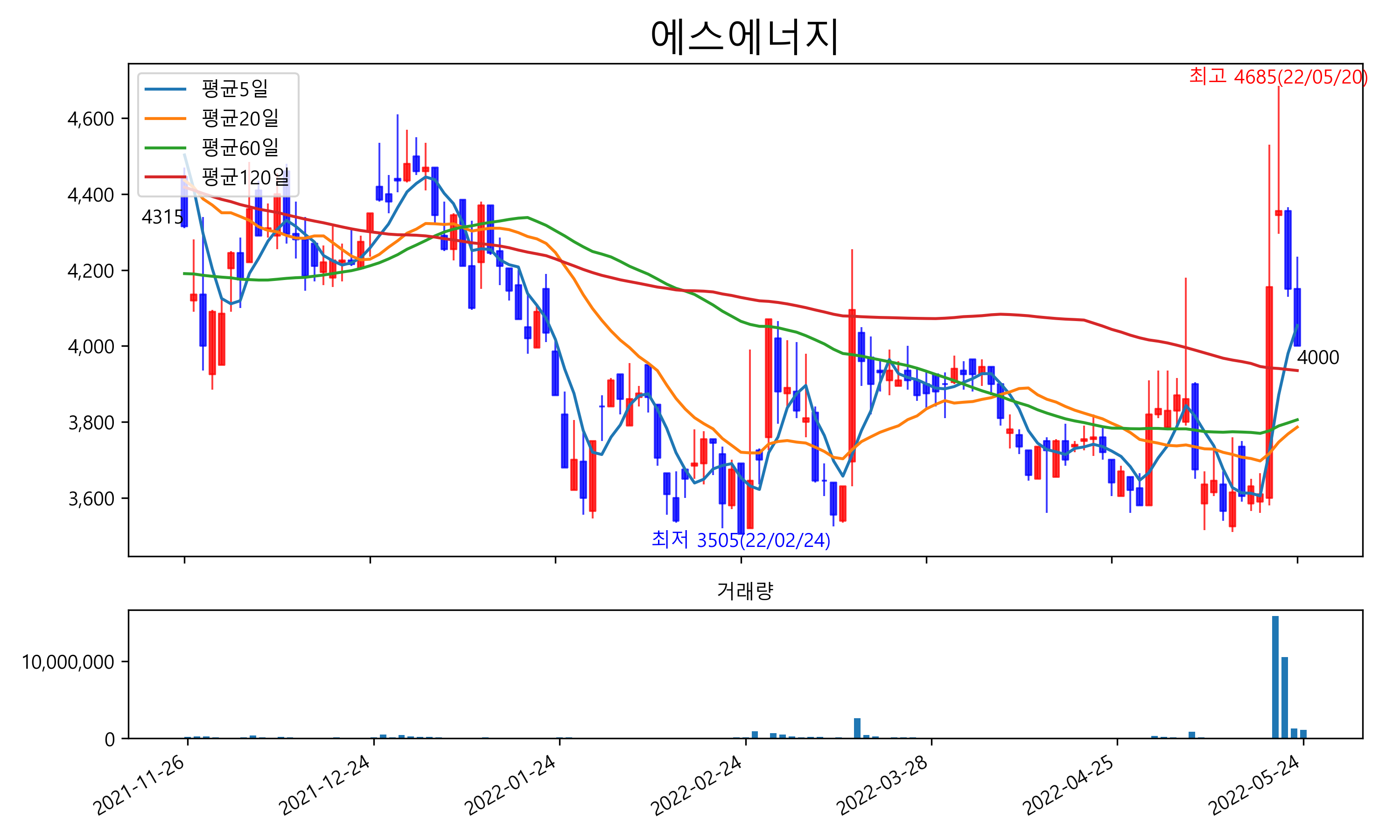 최근 6개월간 캔들차트 및 이동평균선입니다.