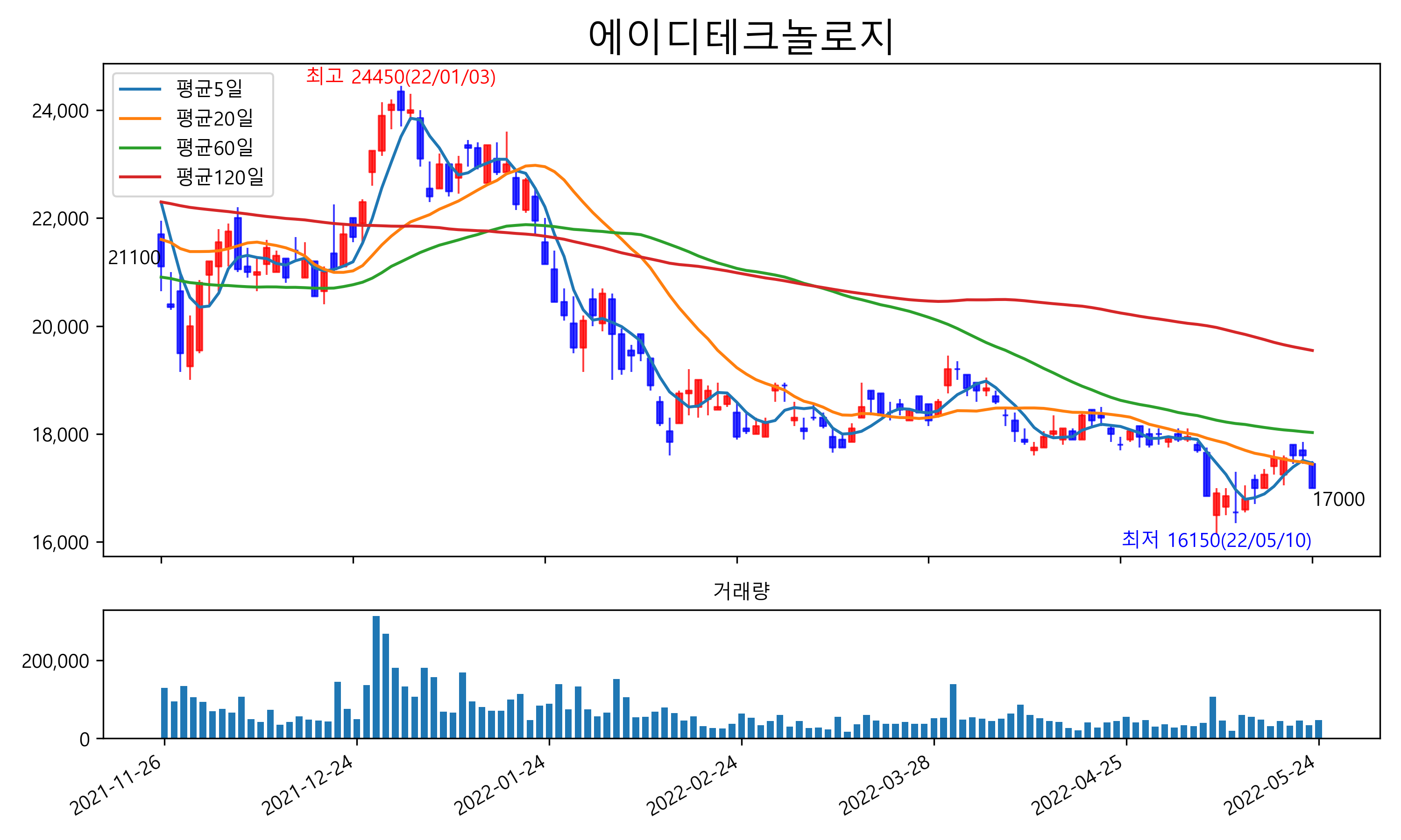 최근 6개월간 캔들차트 및 이동평균선입니다.