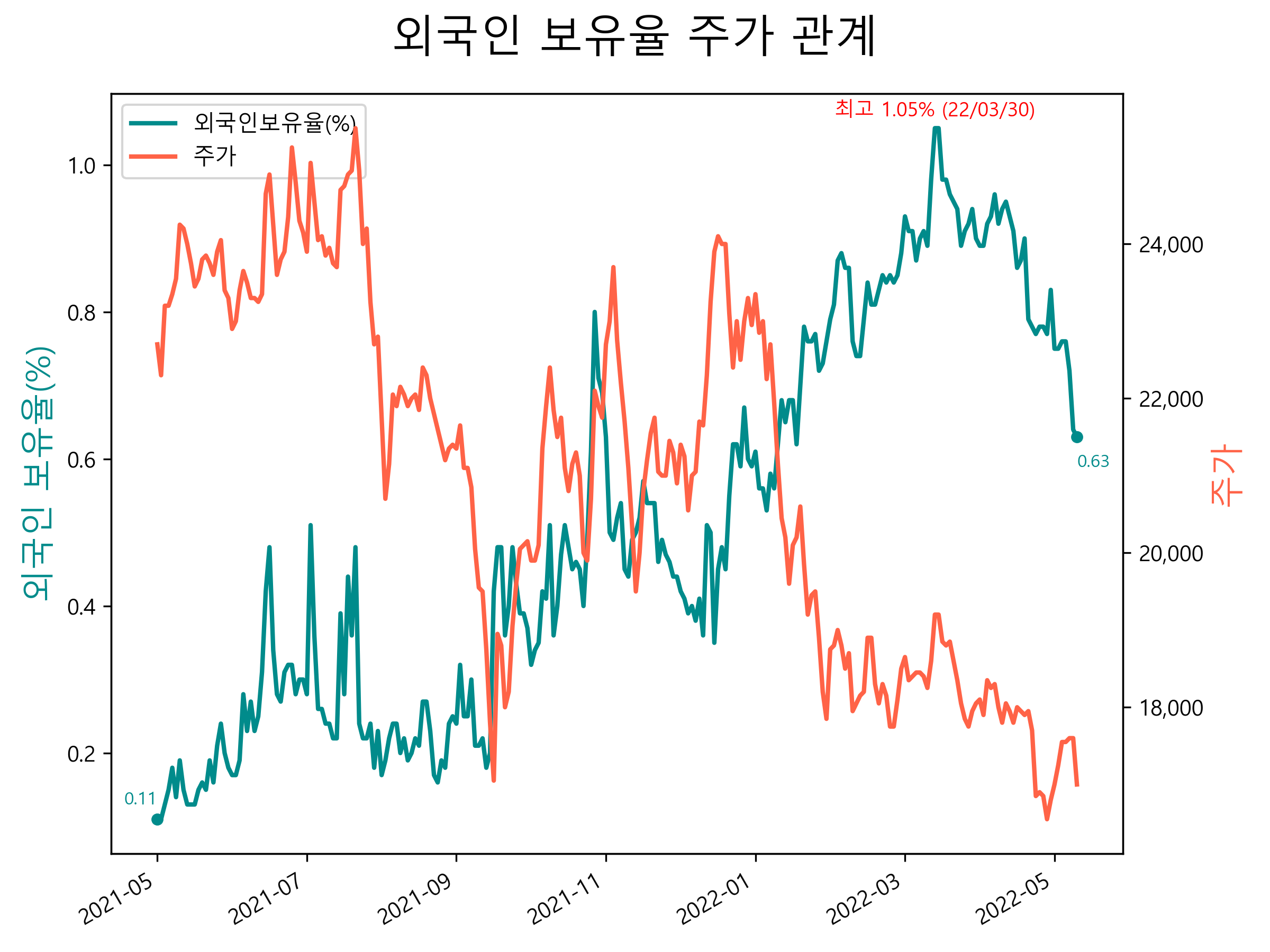 최근 1년간 외국인 보유율 및 주가와의 관계입니다.